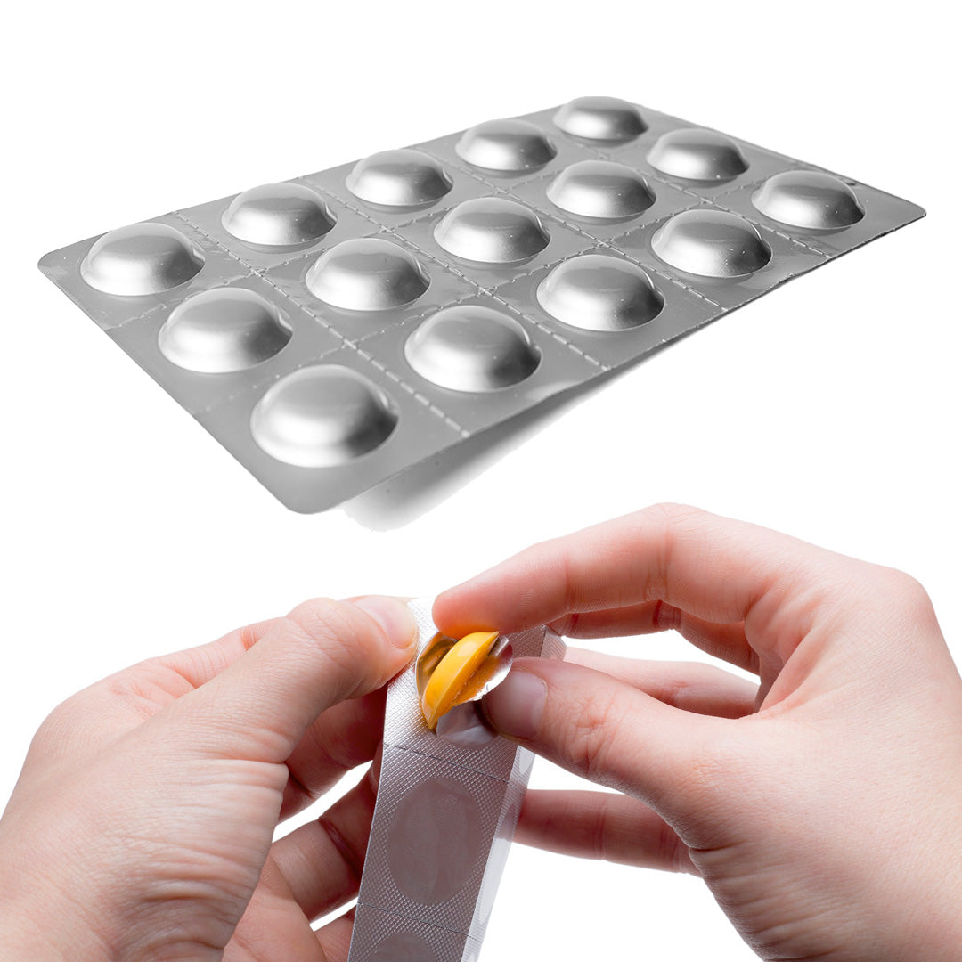 Die kaubaren Gelformen von EasyFishoil werden während der Herstellung direkt auf die leeren Stellen in der Aluminiumblisterschicht aufgetragen und mit Folie abgedeckt. Diese Folie schützt den Inhalt vor Umwelteinflüssen. Während eine Gelform verzehrt wird, bleiben die übrigen Dosen in der Blisterpackung von Luft isoliert. Unveränderte Oxidationswerte