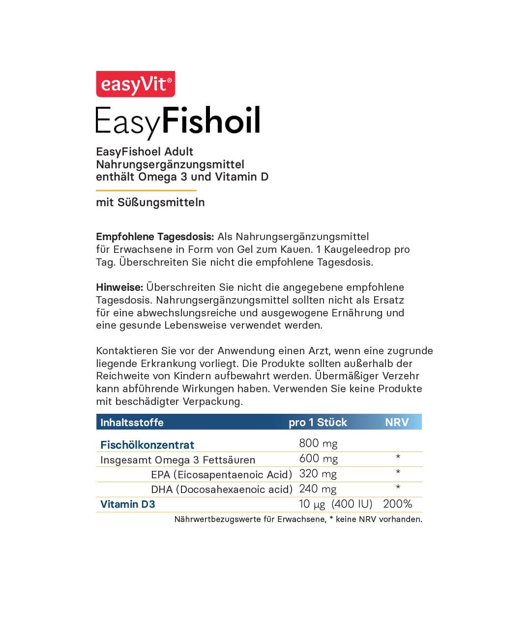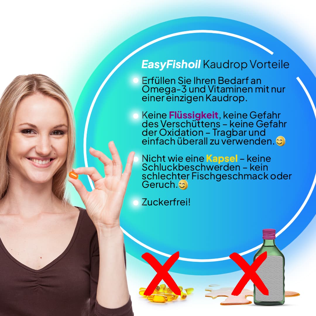 EasyFishoil adult Kaudrops für Erwachsene sind nicht nur lecker, sondern auch vollgepackt mit Omega-3 EPA, DHA und Vitamin D. Diese Nährstoffe sind bekannt dafür, das Immunsystem zu stärken, die Herzgesundheit zu fördern und das allgemeine Wohlbefinden zu unterstützen. Omega-3 EPA und DHA spielen eine wichtige Rolle für die Gesundheit von Herz, Gehirn und Augen, während Vitamin D die Knochengesundheit verbessert und das Immunsystem stärkt. Mit unseren Kaudrops wird die Einnahme dieser wichtigen Nährstoffe zu einem angenehmen und unkomplizierten Erlebnis.