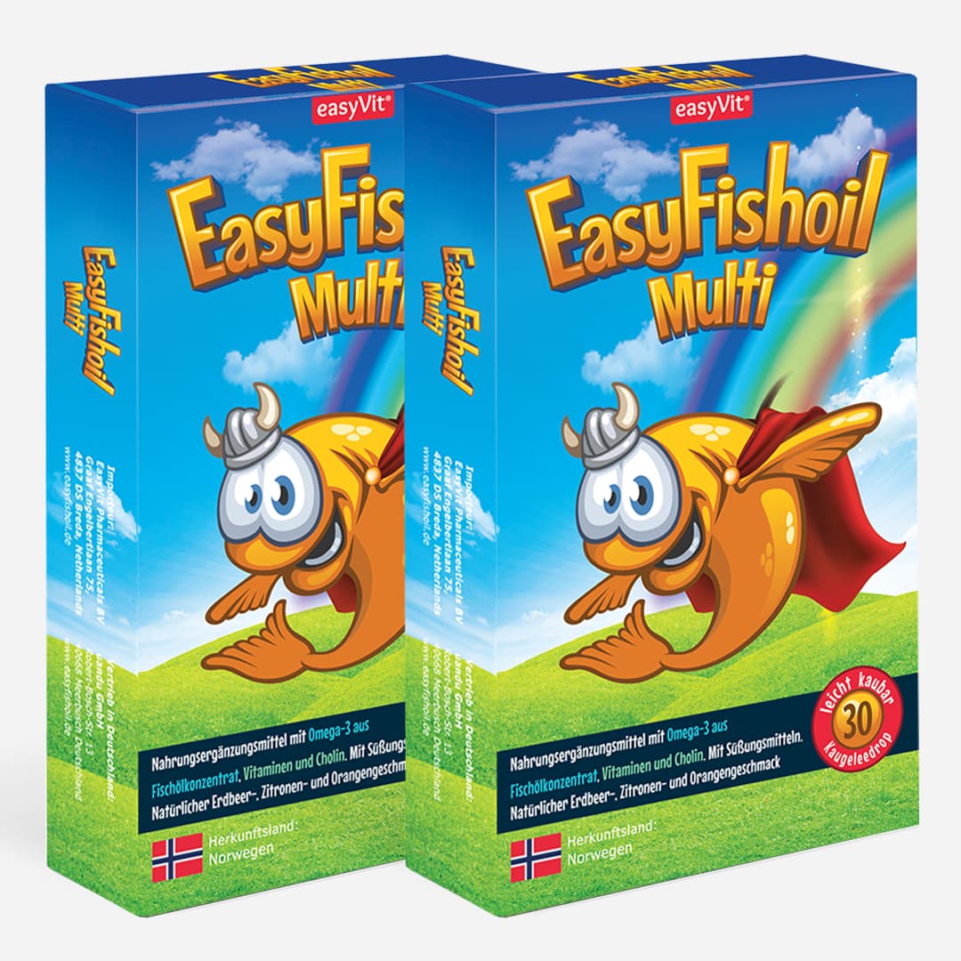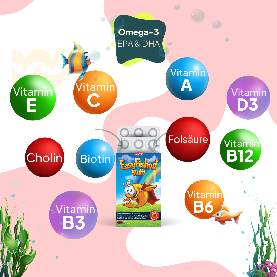 EasyFishoil Multi bietet eine kinderfreundliche Kombination aus Omega 3 Fischöl EPA und DHA sowie 10 wichtigen Multivitaminen. Diese einzigartige Formel unterstützt spielend leicht die Ernährung von Kindern, um mögliche Nährstofflücken zu schließen und ihre gesunde Entwicklung zu fördern. Die Fruchtgummis in optimaler Omega 3 Dosierung.Die leicht kaubaren, fruchtigen Gels machen die tägliche Einnahme zu einem Genuss.