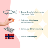 Zutaten: Fischölkonzentrat (31,3%), Süßungsmittel (Xylit), Wasser, Süßungsmittel (Sorbit), Geliermittel (Rindergelatine), Cholin-Bitartrat, Säureregulator (Natriumcitrat), L-Ascorbinsäure, Natürliches Erdbeere Aroma, natürliches Orangen Aroma, natürliches Zitronen Aroma, D-α-Tocopherol, Nicotinamid, färbendes Lebensmittel (Paprika Extrakt), Süßungsmittel (Steviolglycoside), Pyridoxinhydrochlorid, Retinylpalmitat, Cholecalciferol, Pteroylmonoglutaminsäure, Cyanocobalamin, D-Biotin.